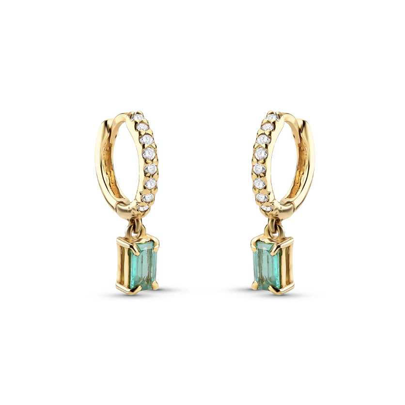 Brinco confeccionado em ouro amarelo 18 quilates (750) com textura polida, duas esmeraldas retangulares com 4x5mm e dezeseis diamantes com 0,5 ponto cada .
